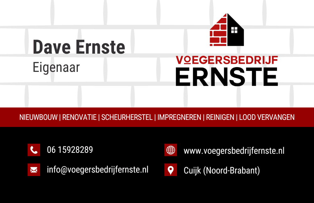 Welkom bij Voegersbedrijf Ernste! Mijn naam is Dave Ernste. Met meer dan 20 jaar ervaring in het vak, specialiseer ik mij in het renoveren van gevels, nieuwbouw, impregneren van gevels, lood vervangen, schoorsteen renovatie, en het reinigen van gevels. Deze ambachtelijke vaardigheden heb ik geleerd van mijn vader, en met toewijding en passie voer ik ze uit. Wij komen altijd vrijblijvend bij u langs om een gedetailleerde offerte op maat te maken. Bent u op zoek naar een ervaren voegersbedrijf met bewezen kwaliteit? Neem gerust contact met ons op.
